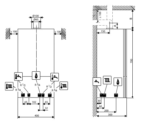 Настенный газовый конвекционный двухконтурный котел Buderus Logamax U072-12K с закрытой камерой сгорания. Мощность - 5,4-12 кВт. Расход природного газа - 2,1 м3/ч. Производительность горячей воды при t 25°C - 8,6 л/мин. Коаксиальный дымоход - 60/100 мм. Габариты - 400x700x300 мм. Масса - 29 кг.