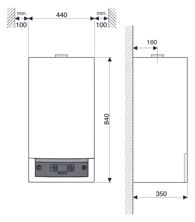 Настенный конденсационный газовый одноконтурный котел Buderus Logamax plus GB072-14 с закрытой камерой сгорания. Мощность - 2,9-14,2 кВт. Расход природного газа - 1,52 м3/ч. Коаксиальный дымоход - 80/125 мм. Габариты - 440x840x350 мм. Масса - 43 кг.