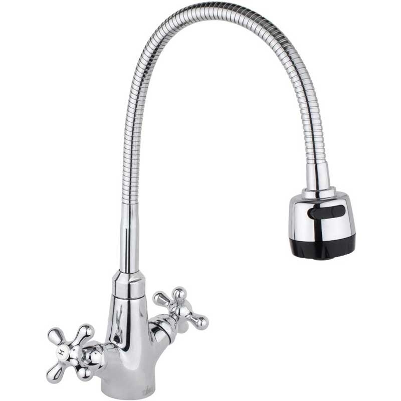 Двухвентильный смеситель с гибким поворотным изливом, лейкой и аэратором, монтируемый в одно отверстие. Имеет долгий срок эксплуатации за счет качественных деталей, неприхотлив в уходе. Станет прекрасным дополнением кухни.