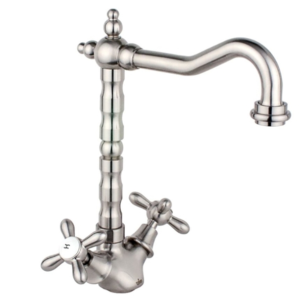 Двухвентильный смеситель с поворотным изливом. Имеет долгий срок эксплуатации за счет качественных деталей, неприхотлив в уходе. Станет прекрасным дополнением кухни.