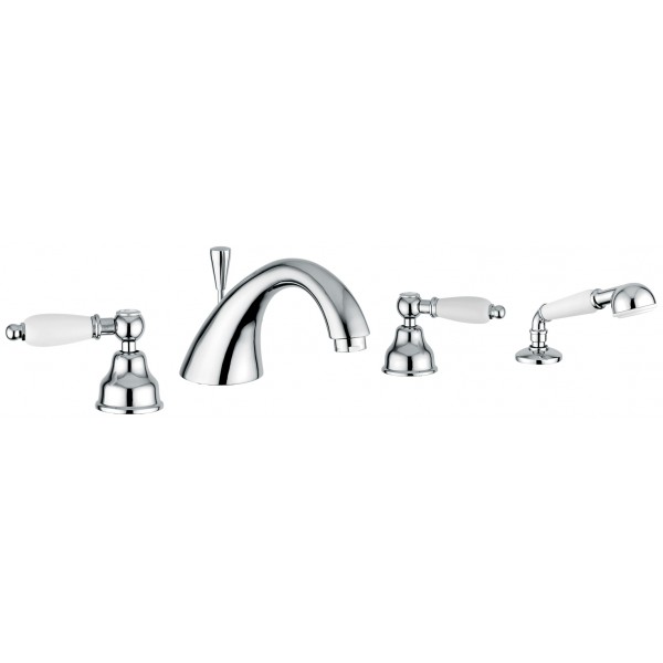Смеситель Emmevi Deco Ceramic 121120 для ванны. Двухвентильный, для установки на край ванны, на четыре отверстия, с ручным душем и дивертером. Цвет хром.