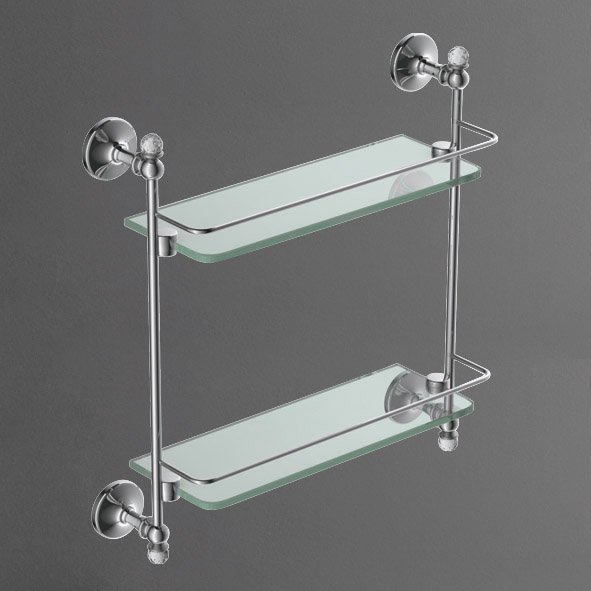 Двойная стеклянная полка AM-E-2682BSJ-Cr - часть серии Antic Crystal от европейского производителя Art&Max. Модель, предназначенная для установки в санузлах, позволяет удобно разместить средства по уходу и гигиене. Металлические элементы изделия выполнены из латуни с износоустойчивым хромированным покрытием. Полка украшена четырьмя круглыми кристаллами Swarovski.