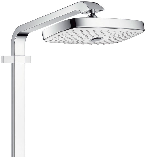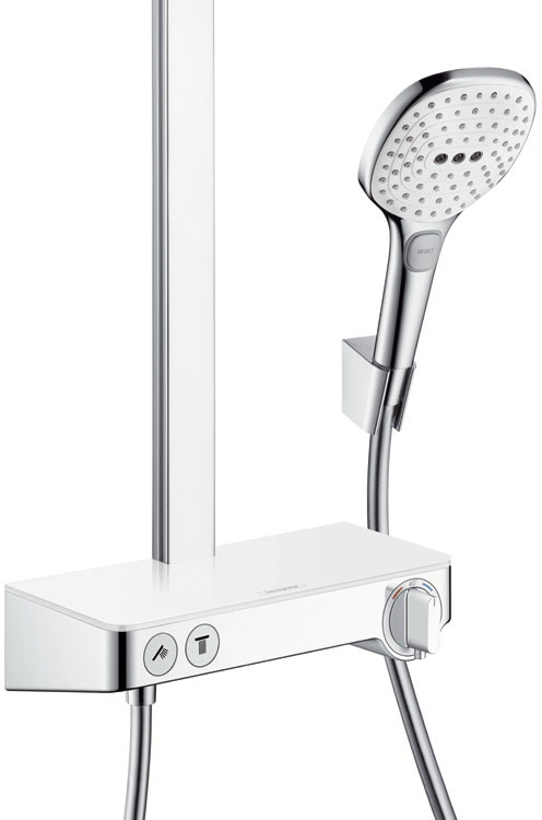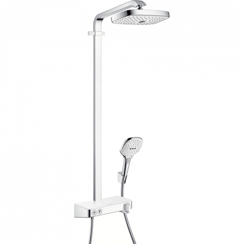 Душевая система Hansgrohe Raindance Select E 27126400 цвет белый/хром. Монтаж внешний, диаметр лейки 300 мм, для переключения режимов душа служит кнопка Select, полка из стекла, термостат с ограничением температуры на 40°C.