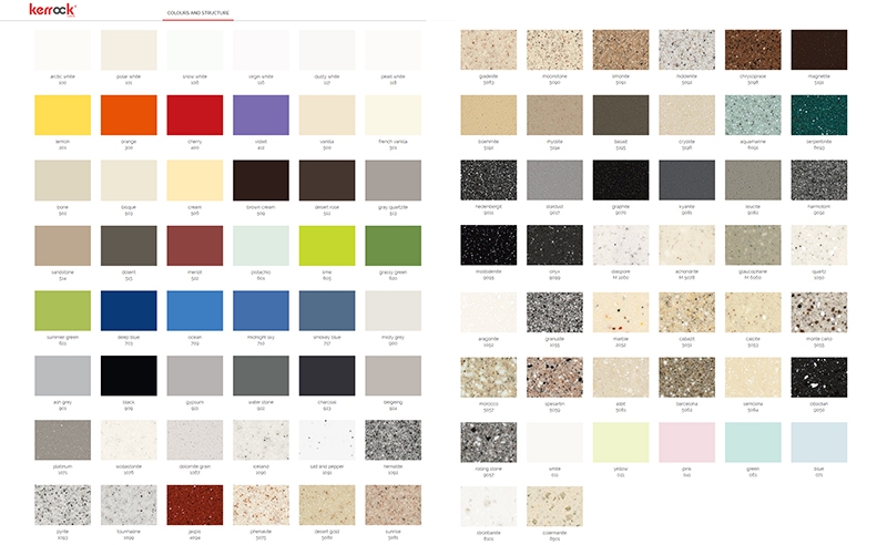 Материал: Kerrock. Это искусственный камень, в состав которого входят гидрооксид и полимерный соединитель базы акрила. Материал гипоаллергенен, отличается прочностью и имеет гладкую поверхность без пор, что препятствует размножению бактерий и облегчает уход за панелью. Он огнеупорный и долговечный, устойчив к химикатам и механическим повреждениям.