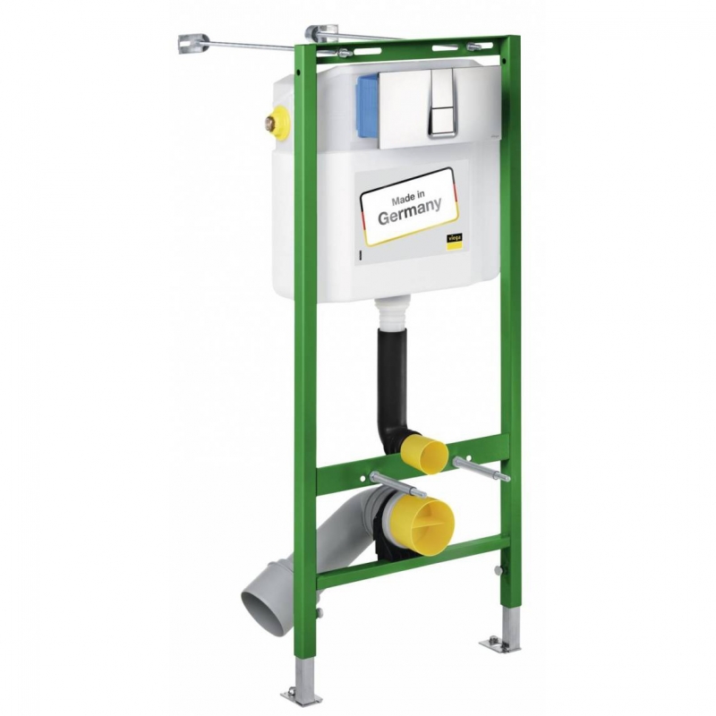 В комплекте поставки: стальная рама с порошковым напылением, смывной бачок Standard 2S с угловым вентилем Rp1/2? клапан заполнения и комплект сливного клапана, эксцентриковый переходник DN90/100 из PP, регулируемое по глубине соединительное колено для подвесного унитаза DN90 из PP, присоединительный комплект для унитаза, крепежный материал для рамы и унитаза (длина настенных креплений 550 мм); для фиксации на металлических каркасных конструкциях в комплект включены саморезы, для крепления на деревянном каркасе - отверстие диаметром 11 мм.