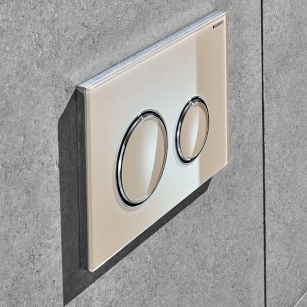 Двухрежимная клавиша смыва для инсталляции Geberit Sigma имеет стильный дизайн, который украсит любую современную ванную комнату. Клавиша имеет прямоугольную форму, выполненную из стекла в песочно-сером цвете, окантовка кнопок в хромовом исполнении.