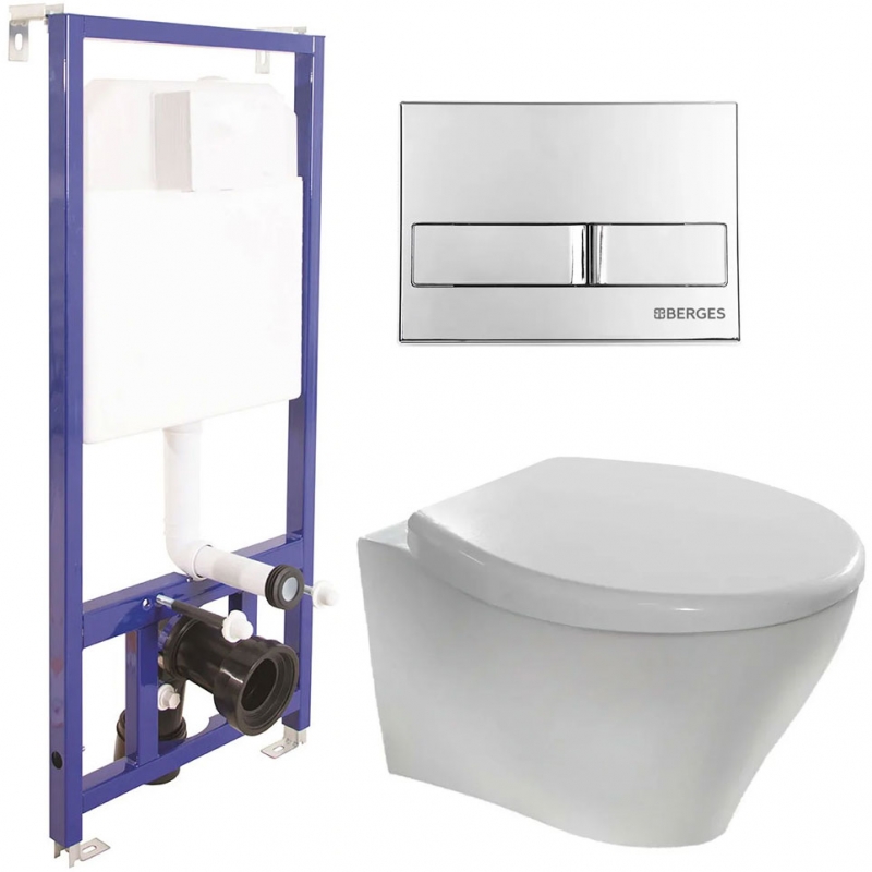 Комплект подвесного унитаза Berges Wasserhaus Top Rimless с крышкой-сиденьем микролифт Mita SO, инсталляцией Novum 525 и кнопкой смыва цвета хром. Артикул: 045213.