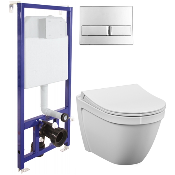 Подвесной унитаз Vitra S 50 5956B003-0101 с сиденьем с микролифтом в комплекте с инсталляцией Berges Wasserhaus Novum L3 040213 и кнопкой смыва цвета глянцевый хром.