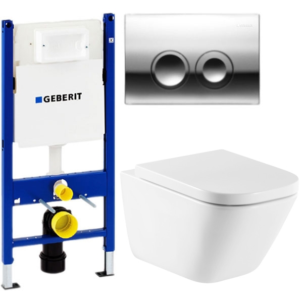 Безободковый подвесной унитаз Roca The Gap Clean Rim 34647L000 с крышкой-сиденьем Roca Soft Close 801472004, в комплекте с инсталляцией Geberit Duofix Delta UP100 458.124.21.1 и кнопкой смыва Geberit Delta 21 115.125.21.1 цвета глянцевый хром. Безободковая конструкция чаши обеспечивает высочайший уровень гигиены и неприхотливость в уборке отсутствием труднодоступных мест для мытья.