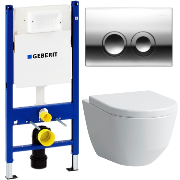 Подвесной унитаз Laufen Pro Rimless 8.2096.6.000.000.1 в комплекте с крышкой-сиденьем Soft Close 8.9695.1.300.000.1 и инсталляцией Geberit Duofix Delta 458.124.21.1 и клавишей смыва цвета глянцевый хром.