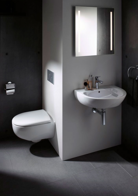 Комплект унитаза Geberit Renova Compact 500.122.TC.R с инсталляцией Duofix, сиденьем soft-close и клавишей смыва. Эффективная безободковая система смыва.