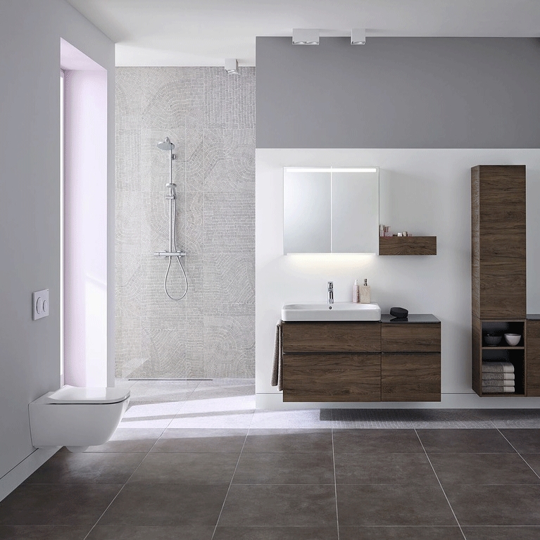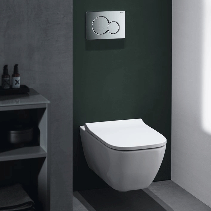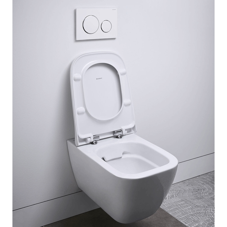 Комплект унитаза Geberit Smyle 500.300.21.S с инсталляцией Geberit Sigma, сиденьем soft-close и клавишей смыва цвета хром. Эффективная безободковая система смыва.