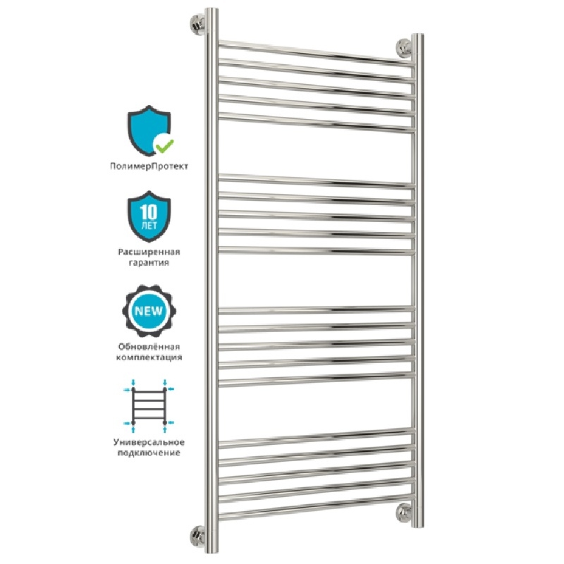 Группировка перекладин 5-5-5-5. Все элементы полотенцесушителя выполнены из нержавеющей стали. Выгнутый радиатор с применением технологии покрытия "ПолимерПротект".