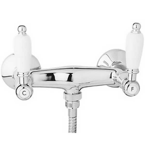 Двухвентильный смеситель, монтируемый в два отверстия. Имеет долгий срок эксплуатации за счет качественных деталей, неприхотлив в уходе. Станет прекрасным дополнением ванной комнаты в классическом или ретро стиле.