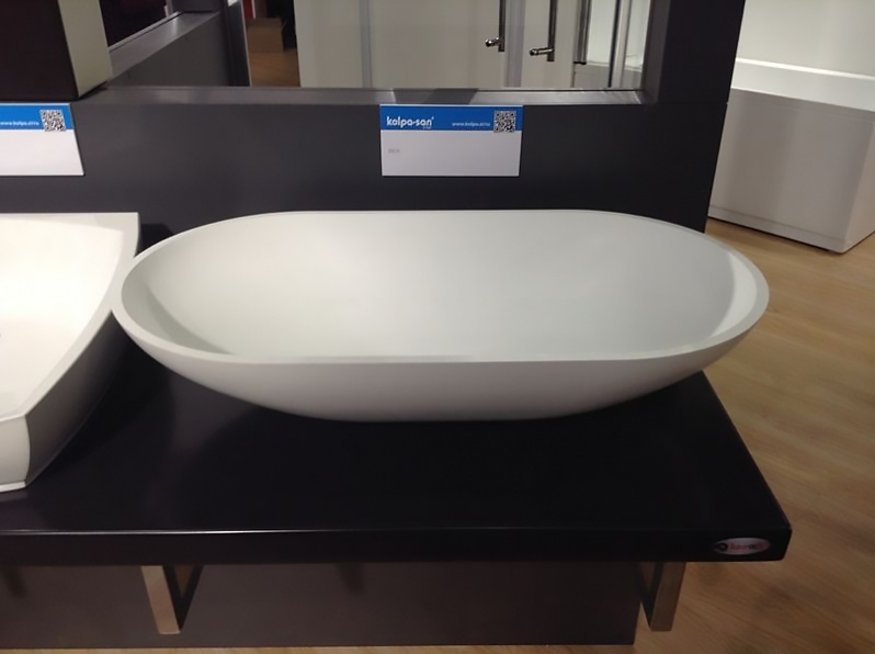Материал: Kerrock. Это искусственный камень, в состав которого входят гидрооксид и полимерный соединитель базы акрила. Материал гипоаллергенен, отличается прочностью и имеет гладкую поверхность без пор, что препятствует размножению бактерий и облегчает уход за раковиной. Он огнеупорный и долговечный, устойчив к химикатам и механическим повреждениям.