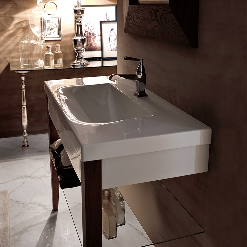 Раковина-консоль Kerasan Bentley 80 3930. Раковина серии Bentley подойдет для установки в ванную комнату оформленную в ретро или классическом стиле. Она изготовлена из фаянса, долговечна и практична. Широкие боковые поверхности позволят удобно разместить ванные аксессуары, к которым необходим быстрый доступ.