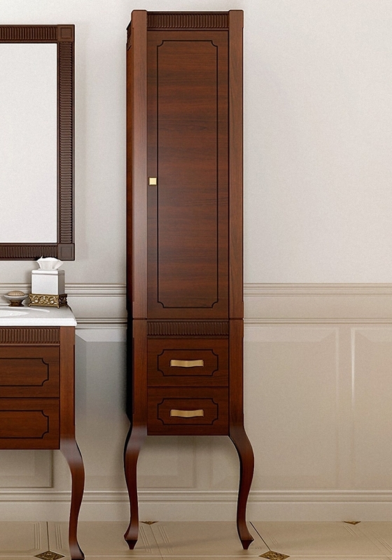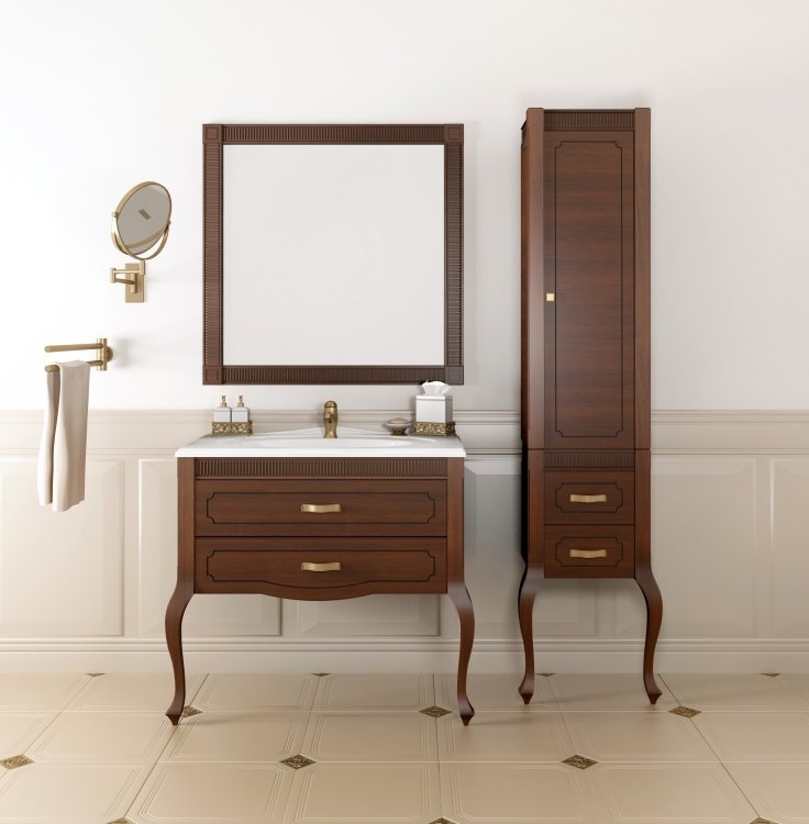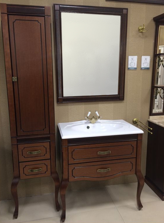 Станет шикарным элементом в интерьере ванной комнаты. Превосходно подходит для классического стиля. Роскошный фасад выполнен с темной патиной в местах глубокой фрезеровки, а также дополнен высокими гнутыми ножками.