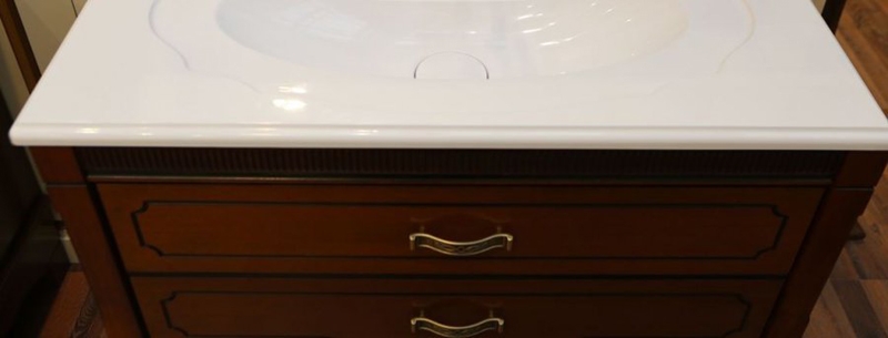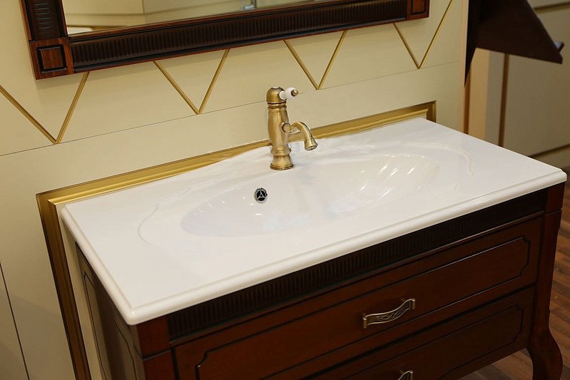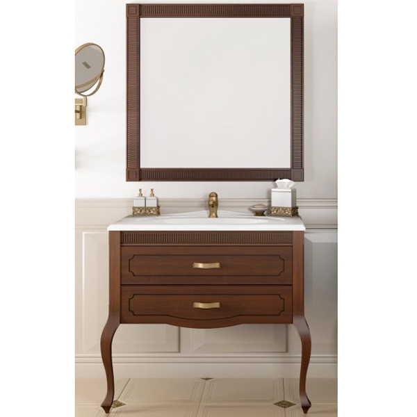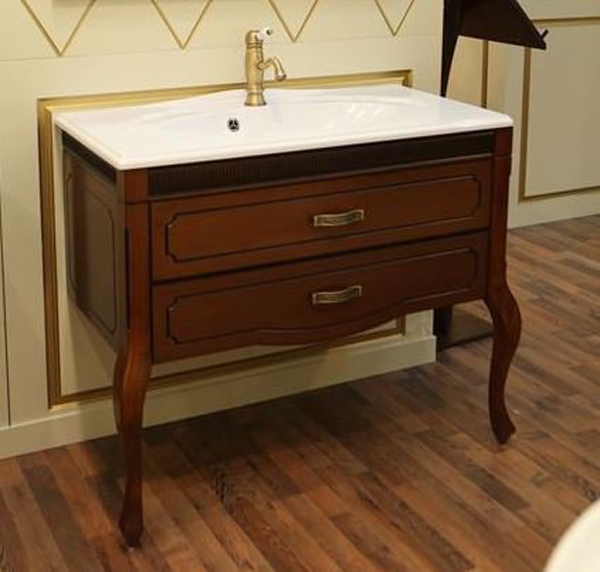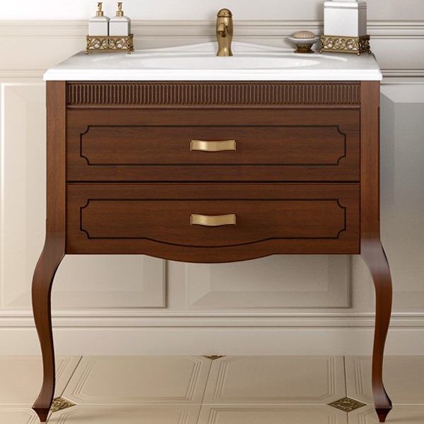 Станет шикарным элементом в интерьере ванной комнаты. Превосходно подходит для классического стиля. Роскошный фасад выполнен с темной патиной в местах глубокой фрезеровки, а также дополнен высокими гнутыми ножками.