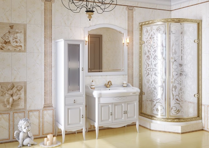 Выполнен в классическом стиле с плавными изогнутыми формами и изящными слегка гнутыми ножками. Фасадные элементы украшены резными узорами, стекло матовое с узором.