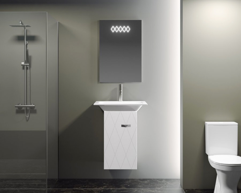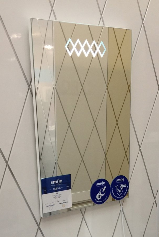 Стильная модель с ромбовидным узором подсветки обладает лаконичным и функциональным дизайном. Прекрасно дополнит современный интерьер небольшой ванной комнаты.