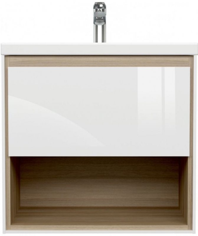 Тумба под раковину Cersanit Louna 60 SZ-LOU-CO60/Wh подвесная выполнена в современном дизайне сочетающим чистоту белого цвета и натуральное дерево. Фрезерованная ручка, выдвижной ящик и удобная открытая полка для хранения.
