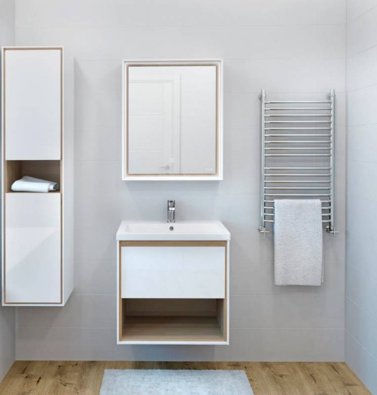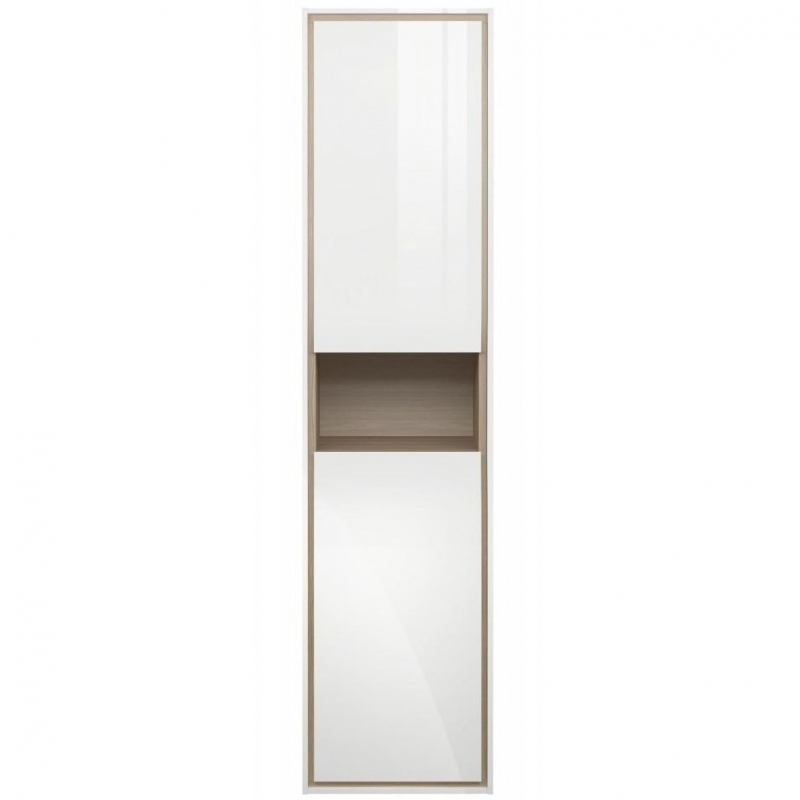 Шкаф-пенал Cersanit Louna SL-LOU/Wh подвесной оборудован стеклянными полками и открытой нишей.