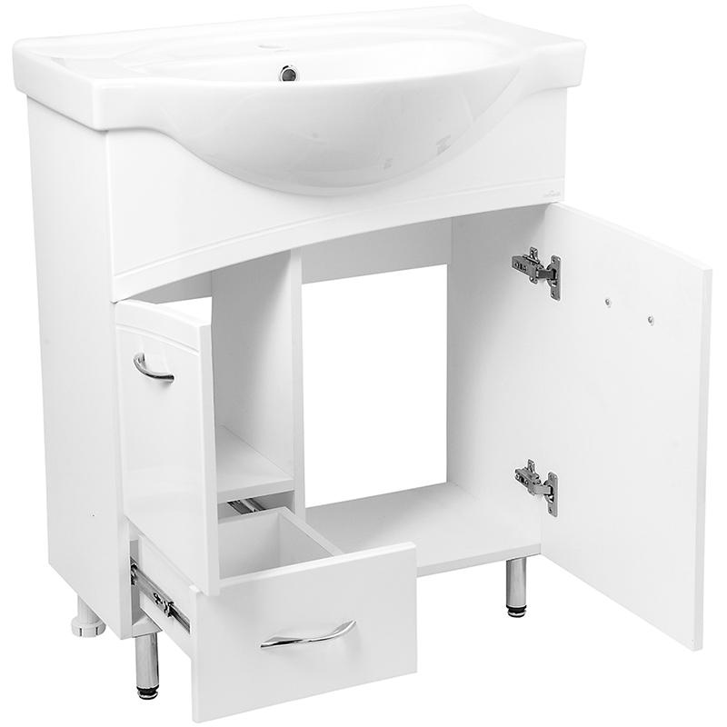 Тумба оснащена ящиком и двумя дверцами, механизмами плавного и бесшумного закрытия, направляющими скрытого монтажа.</