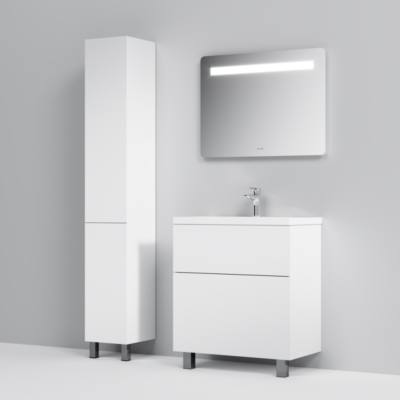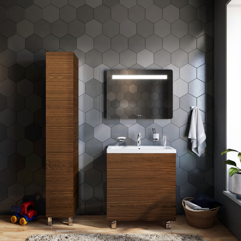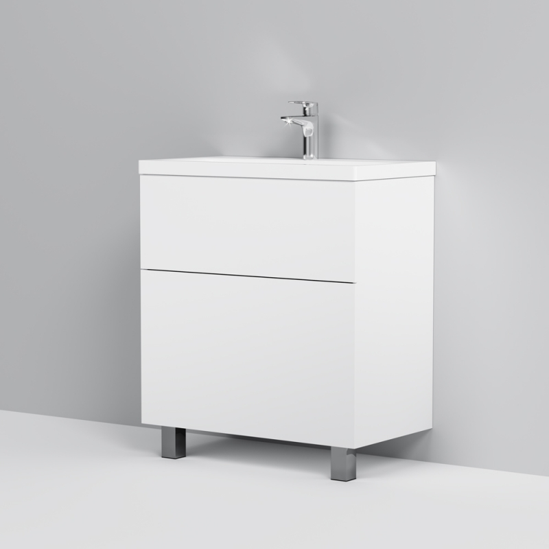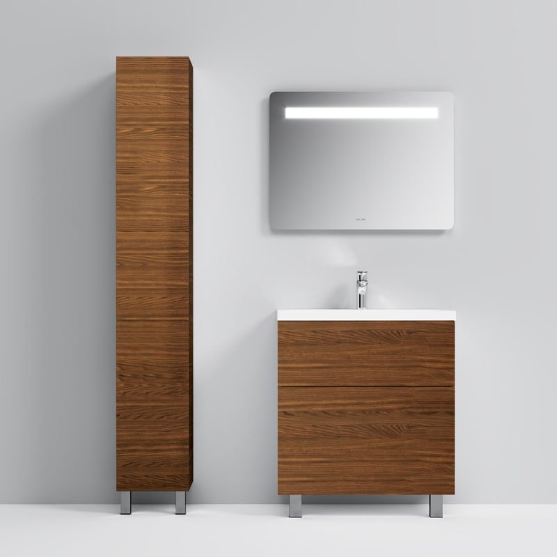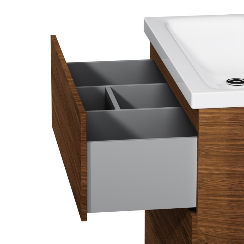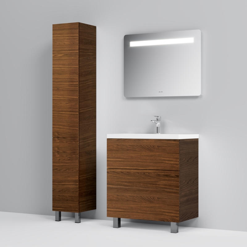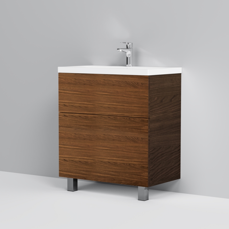 Тумба под раковину AM.PM Gem 75 M90FSX07522NF32 цвета орех, с фактурной поверхностью, с двумя выдвижными ящиками, с двумя хромированными ножками, для длительного срока службы в ванных комнатах с повышенной влажностью.