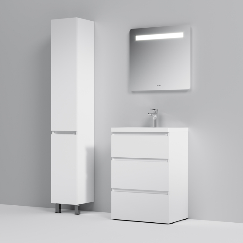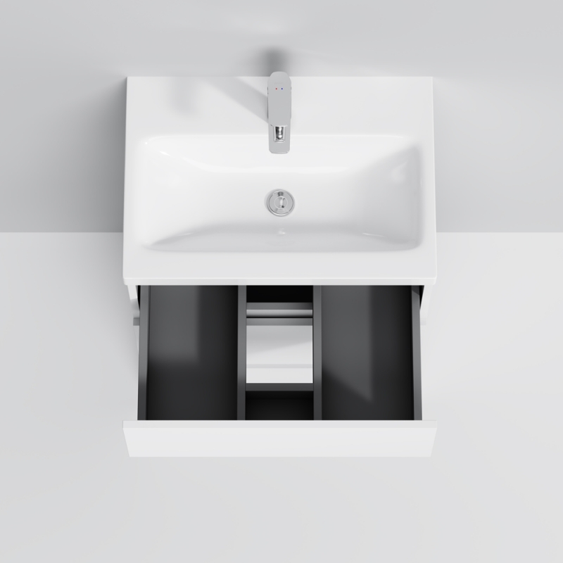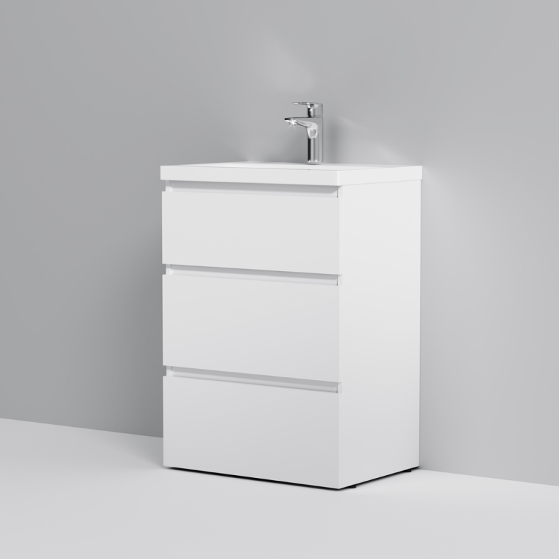 Тумба под раковину AM.PM Gem S 60 M91FSX0602WG белая, с глянцевой поверхностью, с тремя выдвижными ящиками, с двумя хромированными ножками, для длительного срока службы в ванных комнатах с повышенной влажностью.