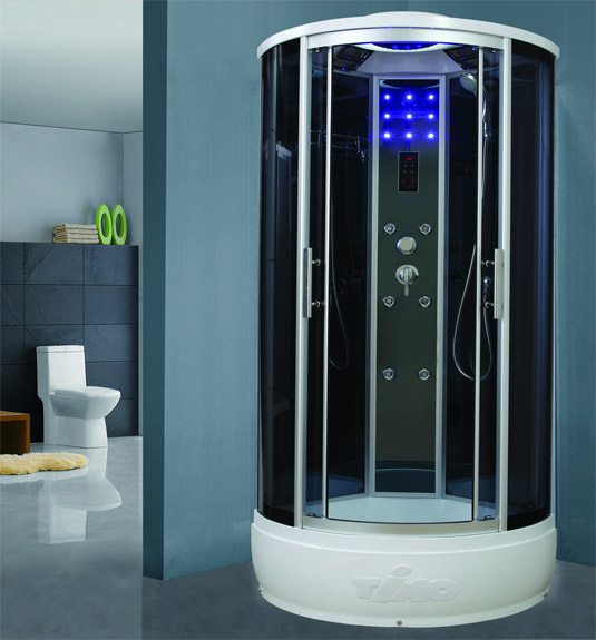 Душевая гидромассажная кабина T-1180. В комплектацию входит: поддон - 35 см, съемный экран, сливная система clik-clak с сифоном, анодированный алюминиевый профиль (матовый хром), закаленное стекло 5 мм, сенсорный пульт управления, подсветка верхняя и боковая, FM-радио, вентиляция, смеситель однорычажный - три режима, тропический душ, лейка, спинной массаж 6 форсунок, двойные ролики, стеклянная полочка.