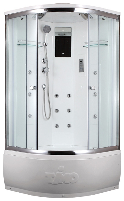 Душевая кабина T-7790. В комплектацию входит: акриловый поддон 48 см съемный экран, сливная система clik-clak с сифоном, акриловая армированная монолитная задняя стенка, анодированный алюминиевый профиль, закаленное стекло 6 мм, сенсорный пульт управления, подсветка верхняя, FM-радио, вентиляция, смеситель однорычажный - четыре режима, тропический душ, лейка, раздельный гидромассаж спины 6+6 форсунок, двойные ролики, стеклянные полочки, зеркало, ручки.