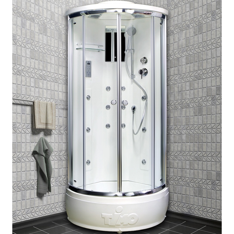 Гидромассажная душевая кабина в современном стиле укомплектована 12 вертикальными форсунками для массажа спины и бедер. Для управления встроен сенсорный пульт. Смеситель с фирменным картриджем Тимо - однорычажный четырехрежимный. В крыше встроен верхний тропический душ (прочный пластик). Ручная лейка (прочный приятный пластик) закрепляется на регулируемой по высоте штанге. Для комфортного использования есть электрическая вентиляция, подсветка, зеркало, полочка и FM радио.