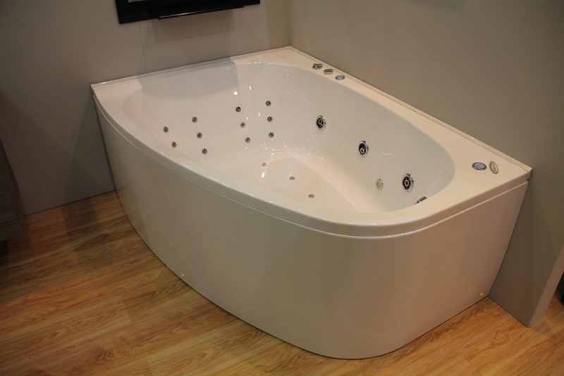 Асимметричная угловая ванна с плавными линиями украсит любую ванную комнату.