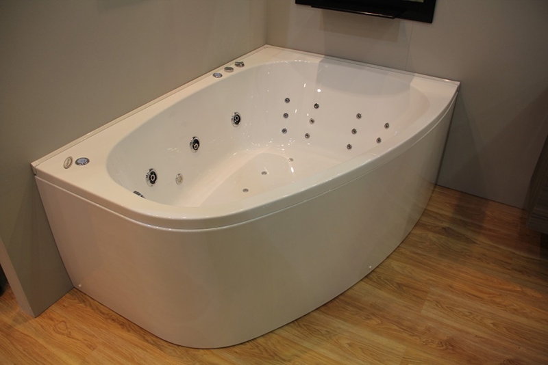 Асимметричная угловая ванна с плавными линиями украсит любую ванную комнату.