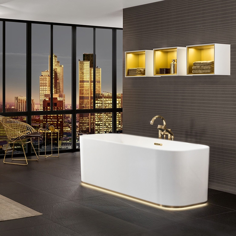 Квариловая ванна Villeroy&Boch Finion 170x70 UBQ177FIN7A200V101 прямоугольная, отдельностоящая, с удобными наклонами для спины с двух сторон, с подсветкой, с фурнитурой цвета шампань.