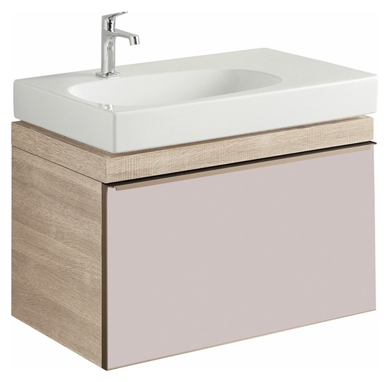 Тумба под раковину Geberit (Keramag) Citterio 835175000. Монтаж подвесной. Корпус: светлый дуб, фасад: стеклянная панель бежевого цвета. 1 выдвижной ящик, ручка светло-палевого цвета. Ширина 73,4 см. Высота 42. Глубина 55,4 см.