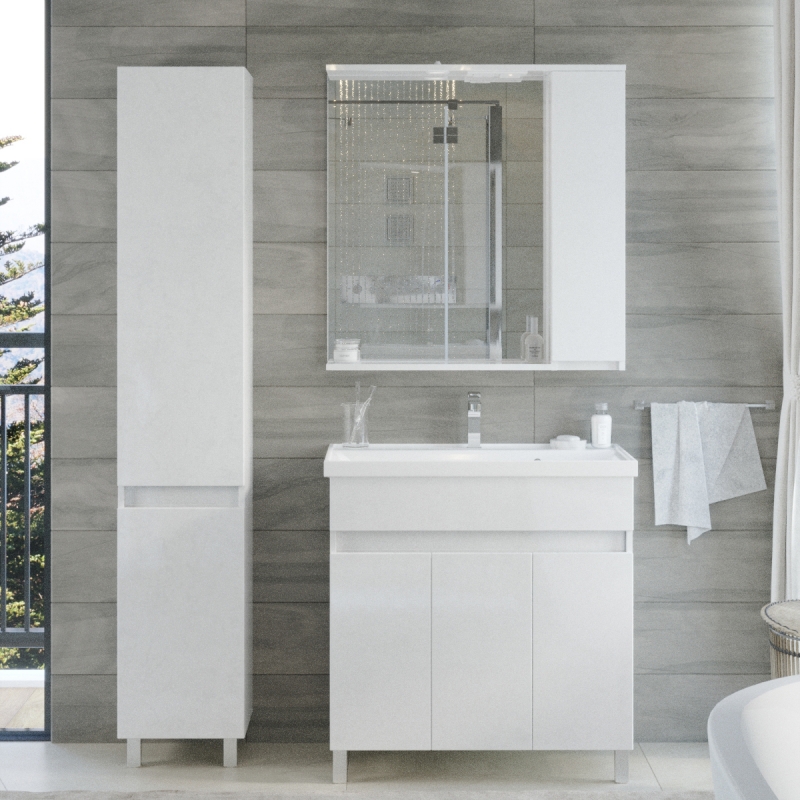 Комплект мебели для современной ванной комнаты, выполненный из материалов, которые устойчивы к перепадам температуры и повышенной влажности. Прост в уходе, сохраняет первоначальный внешний вид на протяжении всего срока службы.