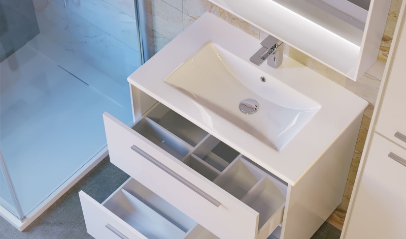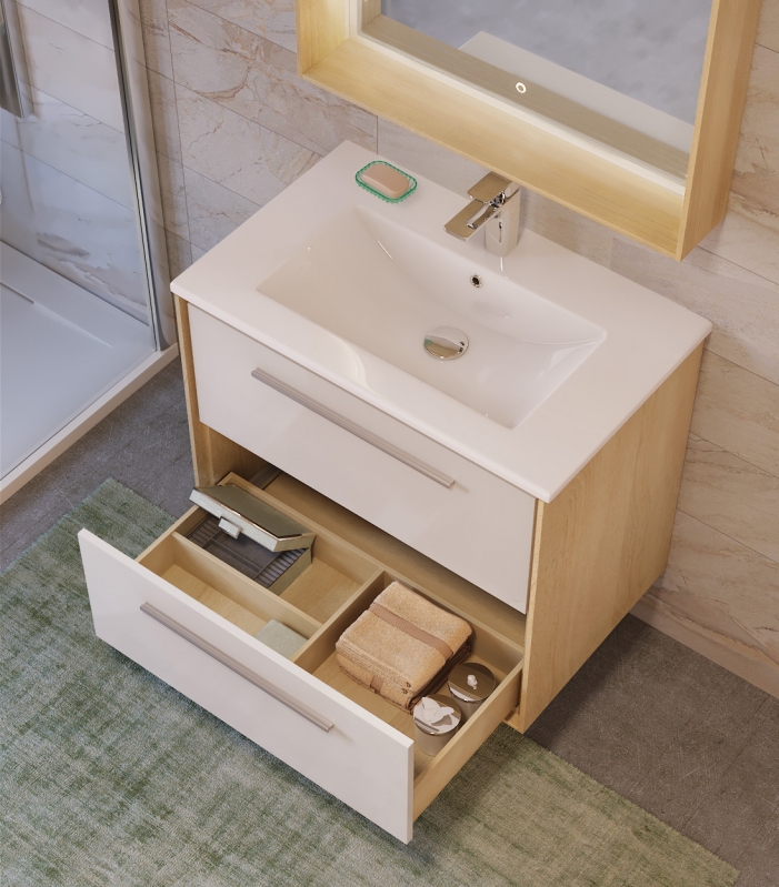 Подвесная тумба под раковину Raval Frame 75 Fra.01.75/P/W с двумя выдвижными ящиками. Предназначена для использования в ванных комнатах с повышенной влажностью. Ящики оснащены доводчиками с функцией плавного закрывания и разделителями для организации системы хранения. Влагостойкие и экологичные материалы, качественная работа фурнитуры, ударопрочность, приятные тактильные ощущения.