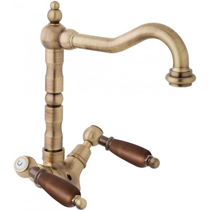 Двухвентильный смеситель с поворотным изливом и аэратором, монтируемый в одно отверстие. Имеет долгий срок эксплуатации за счет качественных деталей, неприхотлив в уходе. Станет прекрасным дополнением ванной комнаты в классическом или ретро стиле.