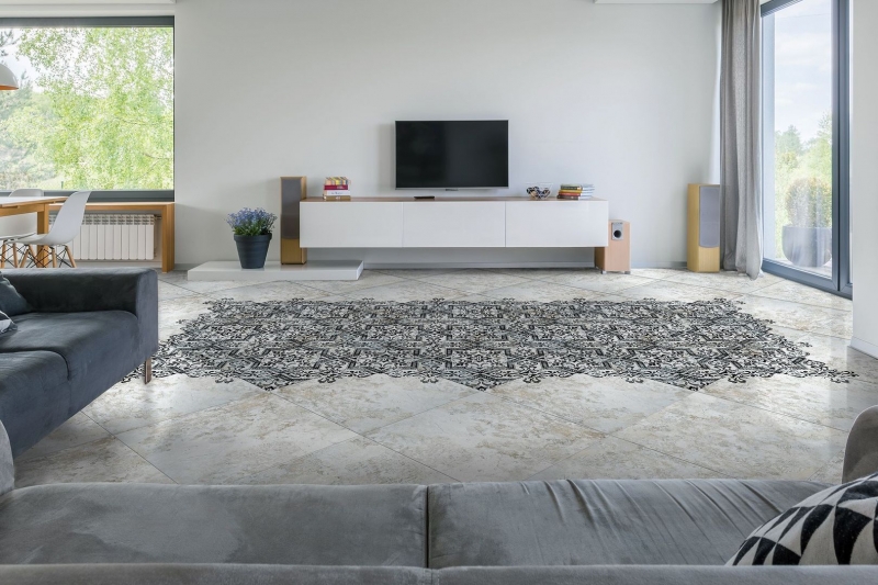 Керамогранит Absolut Keramika Mindanao Decor 60х60 см полностью замощен арабесками. Несет на себе восточный орнамент в черном цвете. Если приглядеться, рисунок на керамике тоже словно бы вытерт от многолетнего использования. В упаковке 4 штуки общей площадью 1,44 м2. Вес упаковки составляет 20,5 кг.