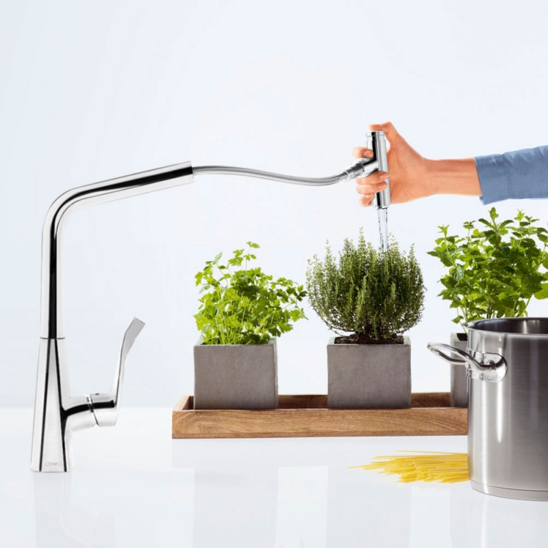 Смеситель для кухни Hansgrohe Metris Select M7115-H320 73803000 с выдвижным изливом, который удобно использовать для набора воды в различные емкости, мытья овощей либо габаритной посуды. Функциональный и стильный смеситель украсит интерьер любой современной кухни.