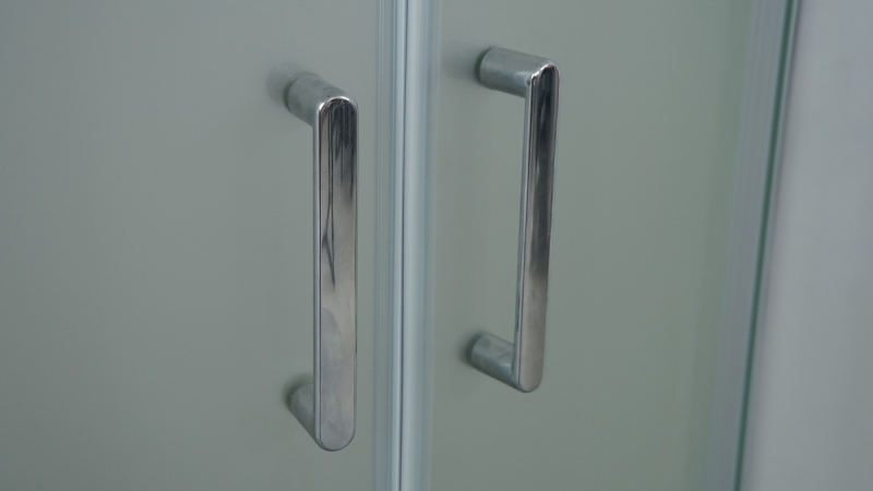 Раздвижные двери душевого уголка на бесшумных двойных роликах открываются комфортно с помощью 2х удобных ручек.