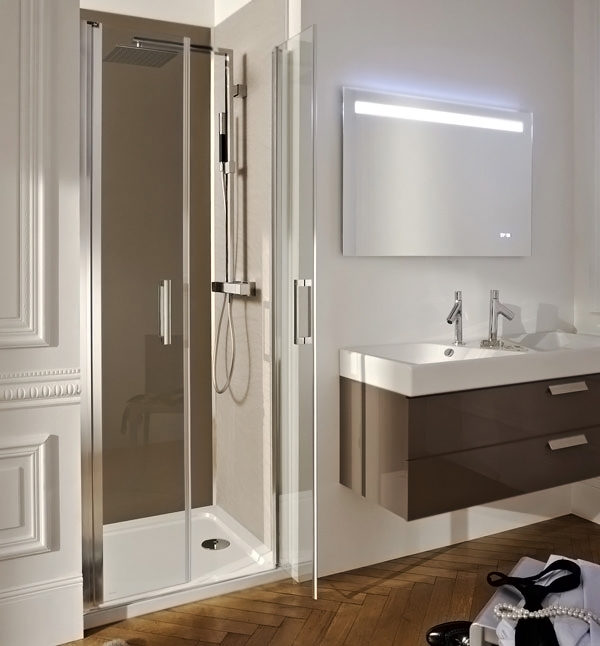 Стеклянная прозрачная душевая дверь в нишу Jacob Delafon Contra 90x200 E22B90-GA с двумя распашными створками. Подходит для людей с ограниченными возможностями.