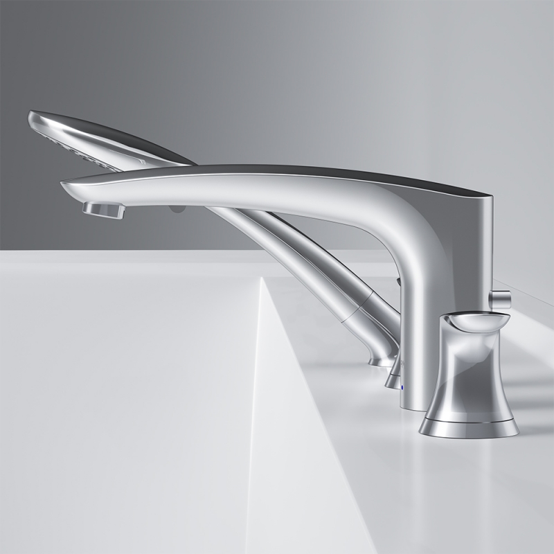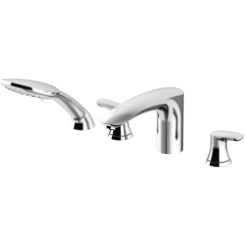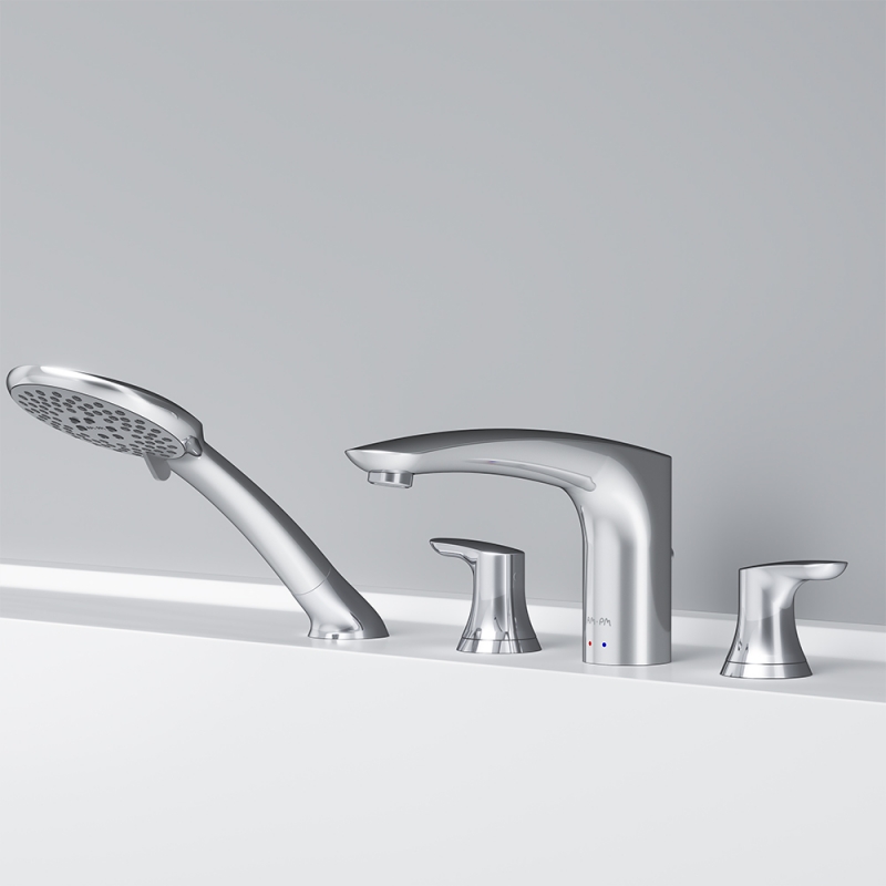 Смеситель на борт ванны AM.PM Like F8001300 двухвентильный, с аэратором, с душевым гарнитуром, монтируемый в четыре отверстия.