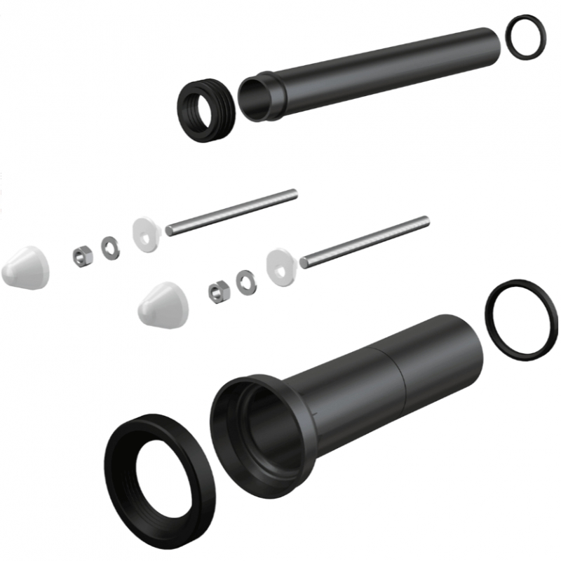 В комплекте поставки: патрубок сливной для подключения подвесного унитаза к стокам, полипропилен, 90 мм, с прокладками, соединительный патрубок для подключения подвесного унитаза к бачку, полипропилен, 45 мм, с прокладками и манжетой, монтажный комплект для крепления унитаза: шпилька М12 – 2 шт, шайба – 4 шт, колпачок – 2 шт, гайка – 2 шт, гофрированный рукав – 2 шт.