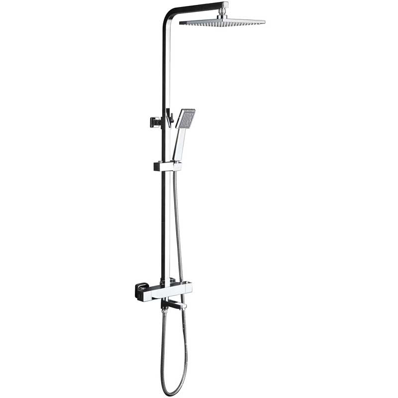 Верхний душ: тропический дождь. Длина кронштейна 32 см. Тонкий квадратный диск. Размер: 23 х 23 см. Штанга регулируется по высоте: +/- 60 см (80 - 140 см).