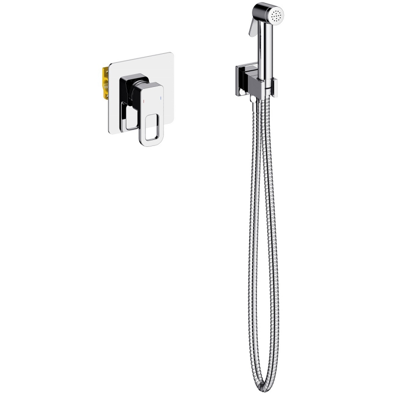 В комплекте поставки: смеситель (со скрытой частью), лейка, шланг, держатель, шланговое подключение.