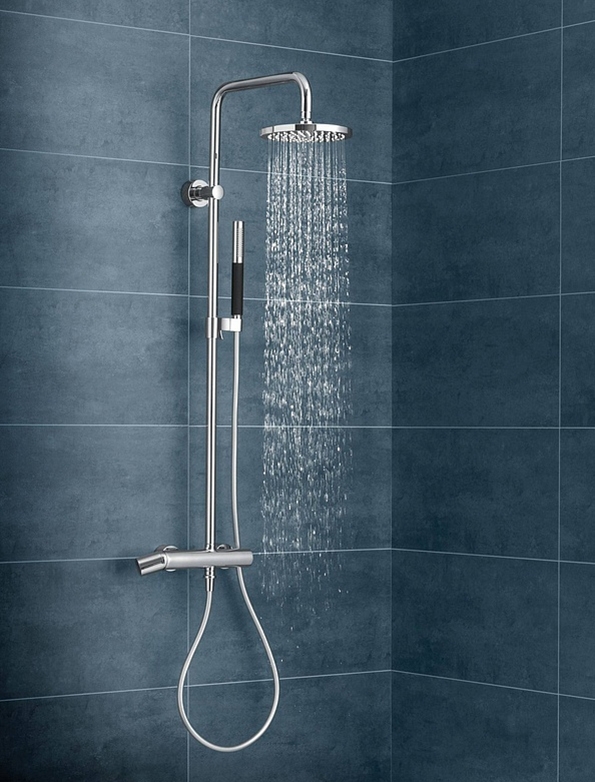 В комплекте поставки: смеситель, шланг, ручной душ, штанга с переключателем и держателем ручного душа, верхний душ и комплект креплений.