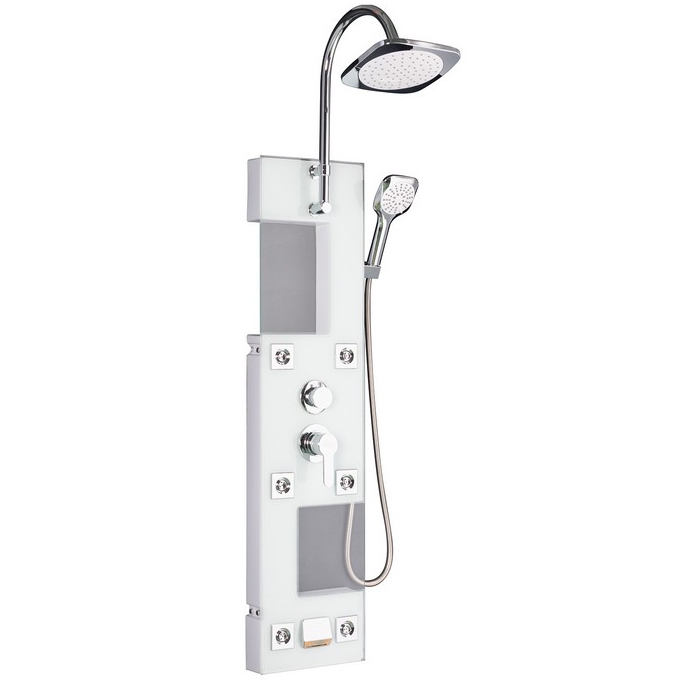 Душевая панель River 11 10000001481 Белая. Панель имеет встроенные две встроенные полочки, верхний душ, трехпозиционный ручной душ, смеситель, каскадный излив, а также шесть гидромассажных форсунок.
