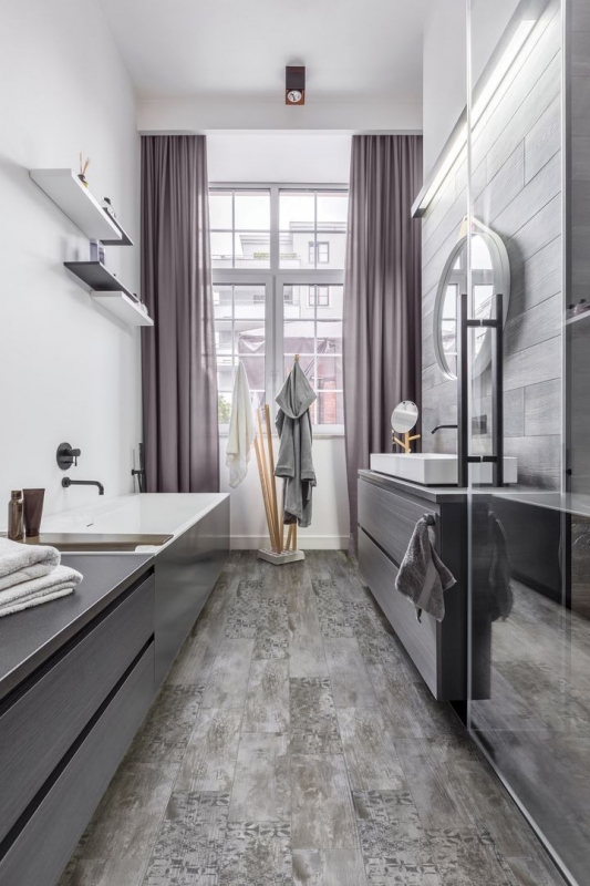 Керамогранит Lasselsberger Ceramics Грей Вуд темно-серый 6064-0166 20х60 см выполнен в виде керамического паркета. Изготавливается на структурном пуансоне, поэтому выглядит очень реалистично, повторяя объемную текстуру брашированной доски. В каждом артикуле имеется несколько вариантов графического рисунка древесного узора, чтобы он не повторялся при выкладке плит и смотрелся натурально. В упаковке 7 штук общей площадью 0,84 м2. Вес упаковки составляет 18,6 кг.